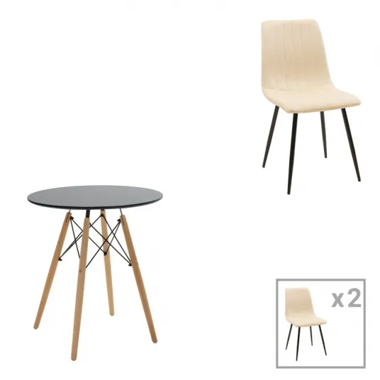 Setul include o masa compacta si doua scaune confortabile, toate realizate din materiale durabile si rezistente. Blatul mesei este confectionat din lemn MDF de inalta calitate, cu grosimea de 16mm, in culoarea neagra, oferindu-i un aspect elegant si o textura placuta. Picioarele mesei sunt din lemn natural, reinfortate cu elemente metalice pentru o durabilitate excelenta, iar capacele din plastic de la picioare protejeaza podeaua de zgarieturi si alte daune.