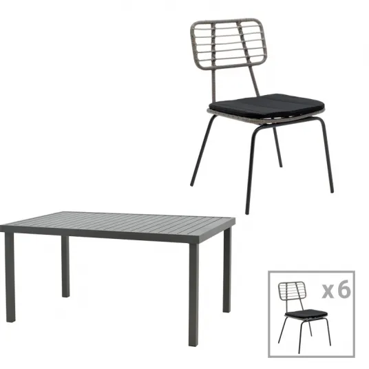 Setul consta dintr-o masa si sase scaune, fiind ideal pentru mesele in aer liber. Masa este construita din aluminiu, un material extrem de durabil, rezistent la conditiile meteorologice, care nu rugineste si nu se corodeaza. Culoarea antracit confera un aspect modern si elegant, perfect pentru orice decor exterior.