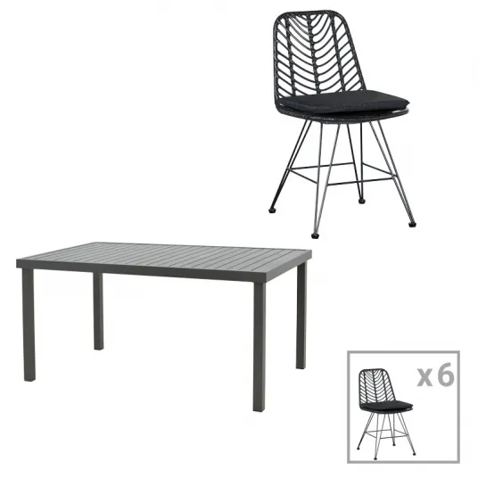 Setul consta dintr-o masa si sase scaune, fiind ideal pentru intalniri cu familia si prietenii. Constructia din aluminiu asigura durabilitate si rezistenta la conditiile meteorologice, fara a se coroda sau rugini. Designul elegant si modern al culorii antracit se integreaza perfect in orice decor exterior.