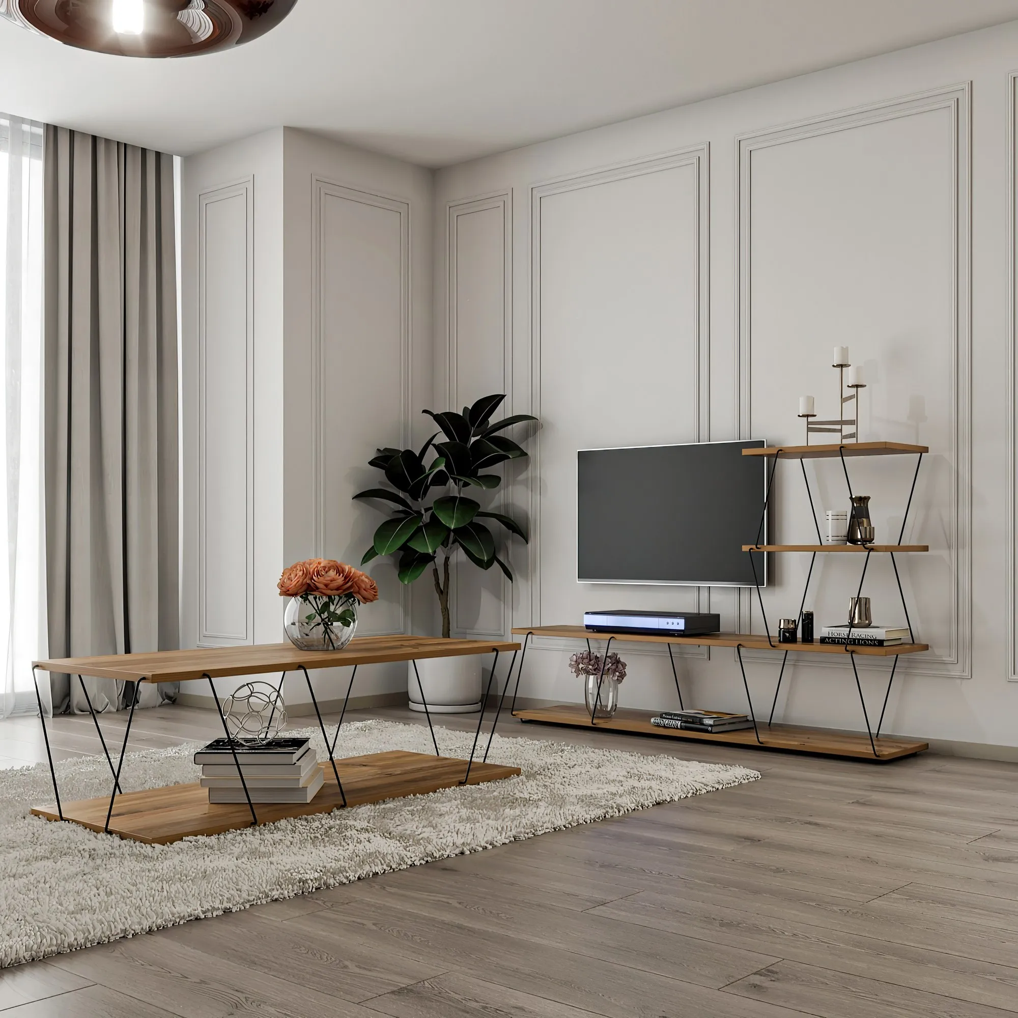 Cu un design elegant si modern, acest set se imbina fara efort cu orice stil de decor. Combinatia de culori pin atlantic si negru adauga o nota de rafinament si eleganta sufrageriei dvs. Cu un suport TV spatios si o masuta de cafea cu numeroase rafturi, veti avea un spatiu de depozitare amplu pentru a va pastra obiectele esentiale organizate si la indemana.