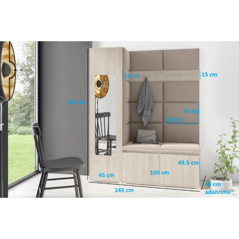 Set mobilier hol, 185x145x40 cm, Ime14- try03 , panouri tapitate, agatatori incluse, pantofar si dulap, stofa maro deschis stejar sonoma, Bortis Impex, fabricat din pal melaminat , 16 mm grosime , culoare stejar sonoma , panouri tapitate stofa maro deschis. Vedeti in imagini dimensiuni exacte . Panourile tapitate se monteaza direct pe perete si in dulap cu lipici. Adezivul rezistent de fixare a panourilor tapitate este inclus in pret , si se gaseste in colete . Panourile trebuie fixate direct pe peretele locuintei dvs si pe placa dulapului ,la fel ca in imagini , in momentul asamblarii , la colturile panourilor turnati putin adeziv din recipient si este fixat rapid . Urmariti si schita de asamblare , usor de asamblat . Se livreaza neasamblat,in colete . Coletele contin tot ce este necesar pentru asamblare .