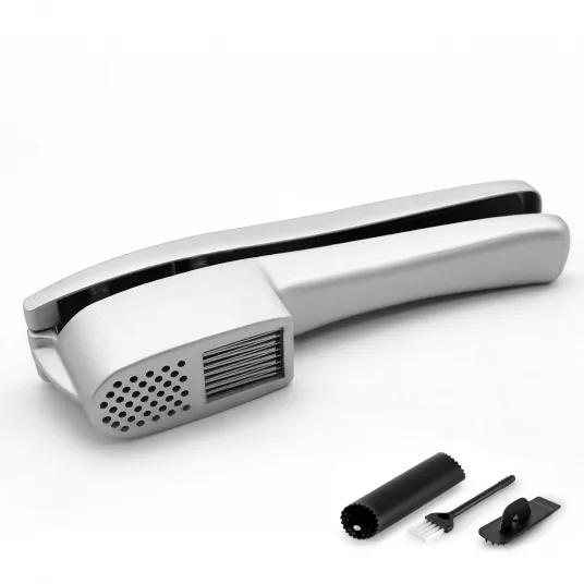 Set Presa de usturoi 2 in 1, cu Curatator de usturoi si unelte de curatare, Inox, Aparat de feliat usturoi usor de stoars, Argint