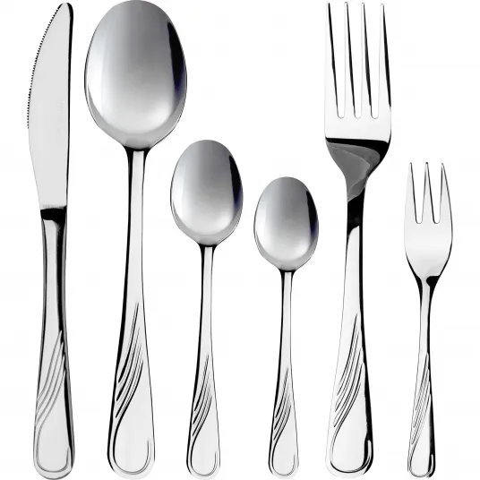 - Setul complet include 6 din fiecare: cutite, furculite, linguri, cutite pentru desert, furculite pentru desert si lingurite.