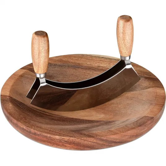 Set tocator de bucatarie si cutit pentru tocat din inox cu 2 lame, Navaris, lemn de salcam, natur