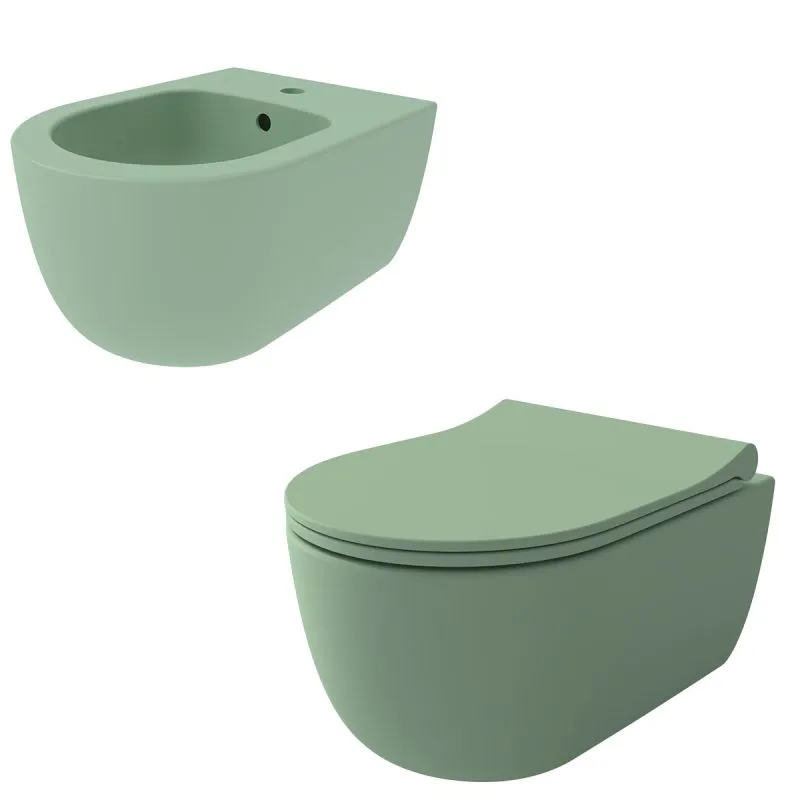 Set vas wc si bideu, Verde Mint, Mat, Power Color, montaj suspendat, 49x36 cm, colectia MichaelCuloare Rezistenta si Aspect ImpecabilTehnologia Power Color garanteaza pastrarea nuantei de verde mint mat in timp, fara riscul de decolorare, zgarieturi sau exfoliere, asigurand un aspect elegant si durabil al baii. Igiena Avansata si Curatare Fara EfortSuprafata neteda, antibacteriana si sistemul Rimless al vasului WC ofera un nivel ridicat de igiena. Apa si murdaria aluneca usor, reducand timpul si efortul alocat intretinerii. Estetica si Functionalitate ModernaFinisajul verde mint mat aduce un plus de rafinament si prospetime spatiului sanitar, iar montajul suspendat creeaza un design aerisit, potrivit pentru orice baie contemporana224299389224299389