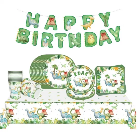 Set Vesela pentru Petrecere Aniversara Dinozauri, 82 piese, Biodegradabil, Multicolor, pentru 20 Persoane