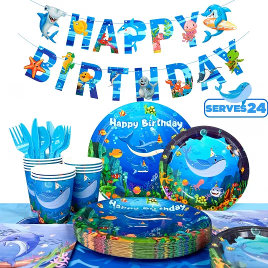 Set Vesela Petrecere InBoxxarty, Tematica Marina, Include Farfurii, Cupe, Tacamuri, Fata de Masa, Banner, pentru 24 Persoane, Albastru