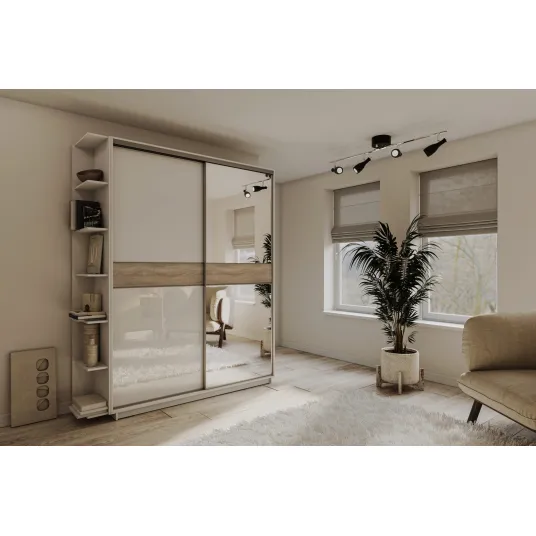 Шкаф купе, Нимфея альба, Фасад - лакобель 9003, дуб сонома трюфель, зеркало серебро