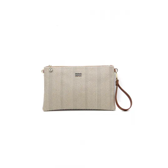 Silver&Polo, Geanta cu model tesut si bareta pentru incheietura, Alb, Maro caramel
