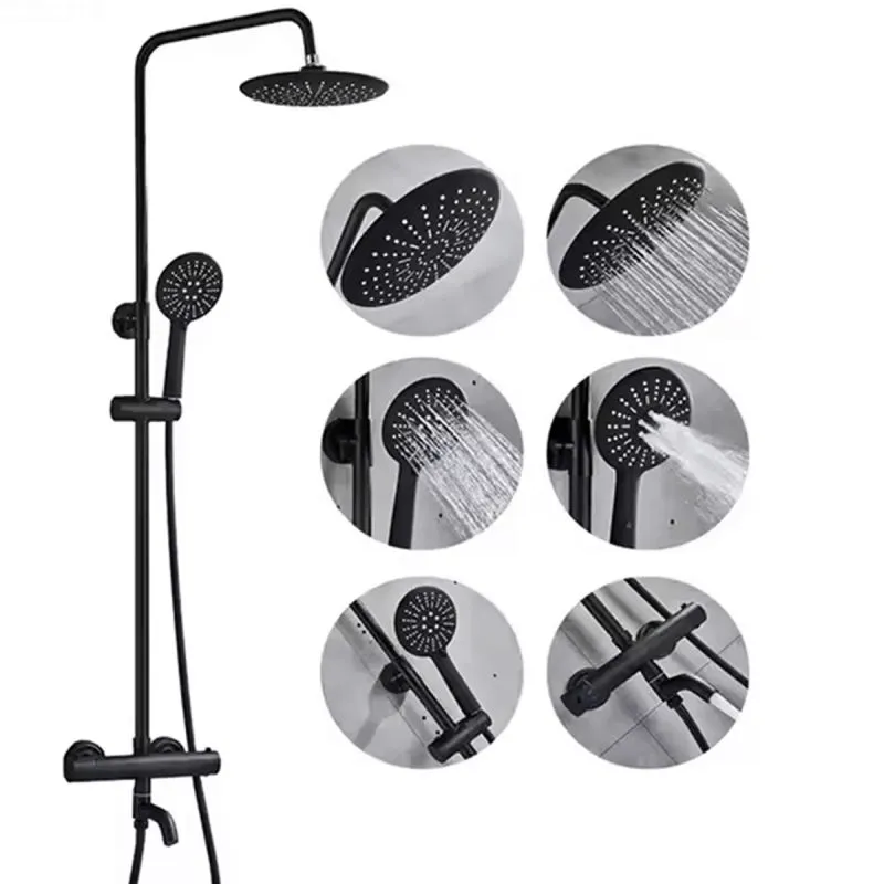 Sistem de dus termostat, 3 functii, baterie cada rotativa, dus tip ploaie, dus de mana, montaj pe perete, Negru Mat, OlympiaDus de mana cu 2 jeturi: Ofera optiuni de jet normal si jet puternic, adaptabile pentru nevoile tale. Control termostatic precis: Valva mentine temperatura constanta, prevenind fluctuatiile bruste si oferind siguranta. Design modern si durabil: Finisajul Negru Mat adauga un aspect sofisticat, iar materialele premium, precum alama si otel inoxidabil, asigura durabilitate.224299401224299401