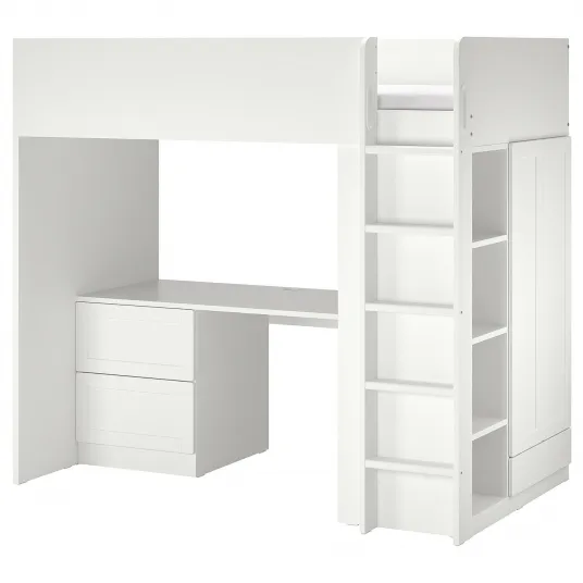 IKEA SMÅSTAD Pat supraetajat, alb cu cadru/cu birou +3 sertare, 90x200 cm