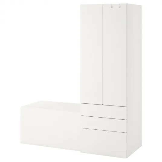 • Nume produs: IKEA SMASTAD / PLATSA Ansamblu depozitare, alb alb/cu banca