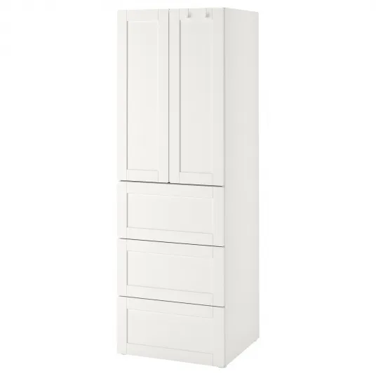 Dulapul SMASTAD are un cadru alb elegant, cu trei sertare spatioase si o tija de suspendare. Dulapul este perfect pentru spatii mici, deoarece vine cu usi glisante care nu ocupa prea mult spatiu. In plus, usile au mecanisme de inchidere usoara care asigura ca nu se inchid trantit si nu provoaca nicio deteriorare a dulapului in sine sau a obiectelor depozitate in ea.