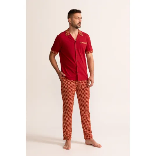 Soft & Seven BY SOFIAMAN, Pijama de bumbac cu pantaloni si camasa, Galben sofran, Rosu inchis, 3XL