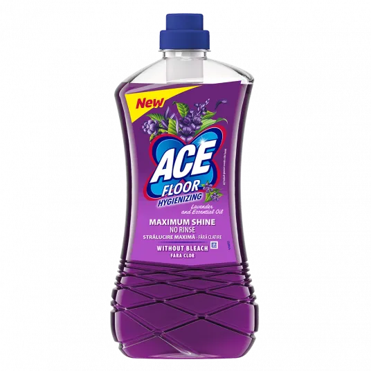 Datorita formulei sale speciale fara clor, ACE Floor, curata in profunzime si igienizeaza toate tipurile de pardoseli, lasand suprafetele stralucitoare cu o singura miscare (nu este nevoie de clatire). In plus, da o senzatie placuta de bunastare si vitalitate datorita parfumului de Lavanda.