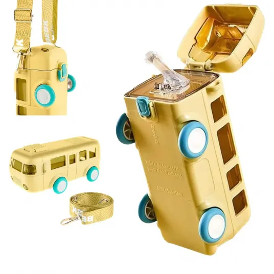 Sticla Apa Pentru Copii / Jucarie Autobuz, SINBINTA, Tritan, Fara BPA, Buton de eliberare cu o singura atingere, Curea de umar reglabila, Design rezistent la scurgeri, Pentru tine, copii, prieteni, familie, ABS/Silicon, 78x72x194mm, Galben