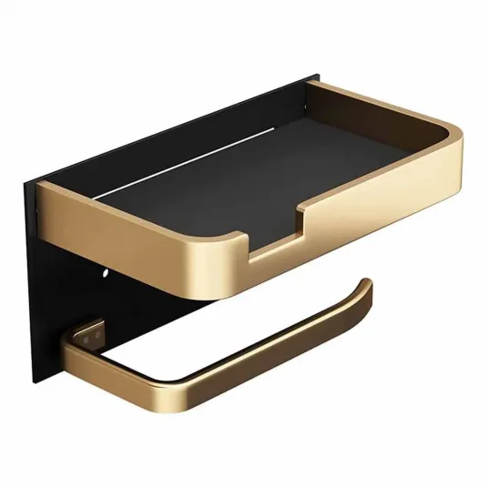 Suport hartie igienica, ZJZ, cu raft depozitare servetele umede/telefon, doua metode de instalare, Aluminiu spatial, 18.6 x 10 x 9 cm, Negru/Auriu
