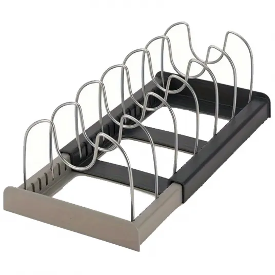 Suport, Hggzeg, Organizator reglabil, Extensibil si glisant, Modern, Usor de curatat, Robust si durabil, 7 separatoare, Pentru tigai, capace, oale, tocatoare si vase, ABS, 30.5-56x20.4x14.7 cm, Negru Gri