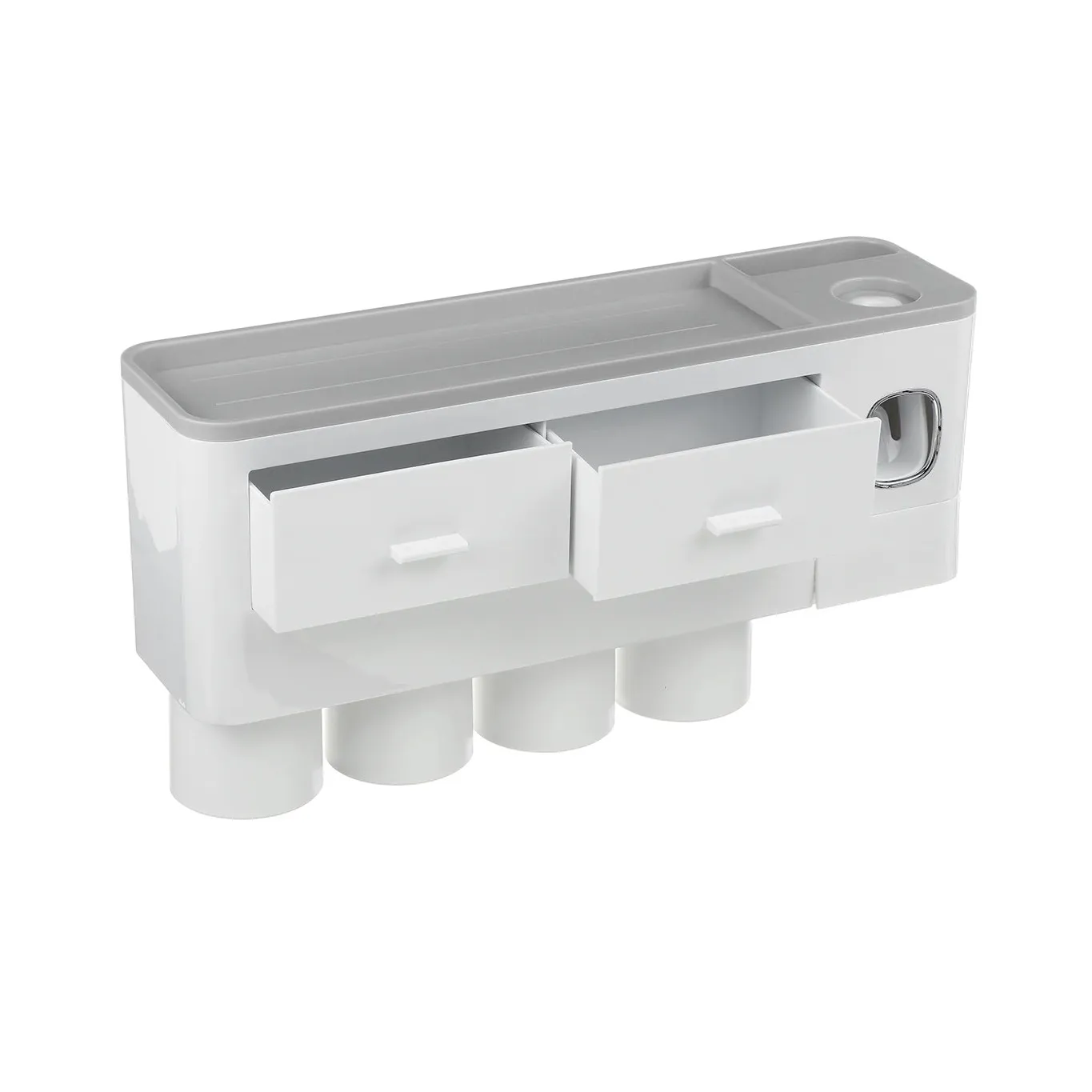 Suport pentru periuta de dinti, BYONDSELF, dispenser pasta de dinti, Multifunctional, Montare pe perete, cu 4 pahare magnetice, 7 pozitii periuta de dinti si 2 sertare, Gri