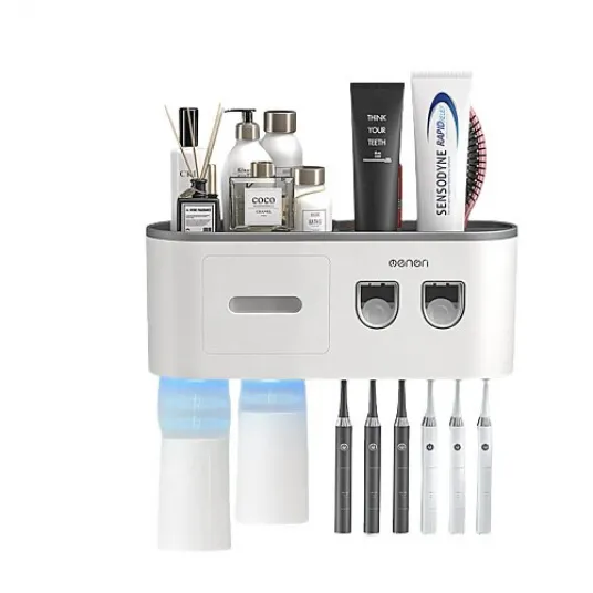 Suport pentru periute de dinti montat pe perete, 6 fante pentru periute, 2 cupe magnetice, 1 organizator de sertare pentru cosmetice, 1 tava mare de depozitare, plastic, alb