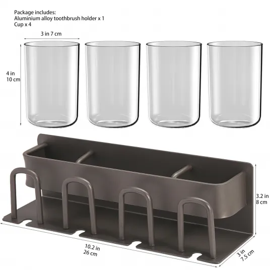 Suport pentru periute de dinti, PHIKER, aluminiu, 4 suporturi pentru periute, 4 cupe, gri