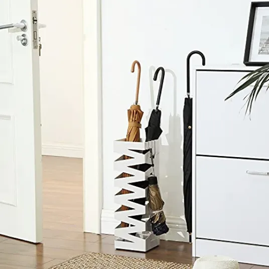 Suport pentru umbrele, Songmics, Alb, 15.5x15.5x49 cmSA SE OPREASCA PLOAIA AICI: Unde s-au dus picaturile de ploaie? In tava de scurgere de dedesubt. Aceasta poate impiedica ploaia sa se scurga pe podea si este detasabila, astfel incat sa puteti curata apa acumulata<br><br>LUNGA SAU SCURTA, LE TINE PE TOATE: Sa atarne umbrele impaturite? Sigur ca da! Cele 2 carlige lungi si 2 carlige scurte incluse asigura acest lucru. Dar umbrele de golf lungi sau role de hartie? Bineinteles. Inaltimea de 49 cm va permite sa depozitati articole inalte<br><br>HOLLOW-OUT DESIGN: Umbrelele ude vor sa se usuce liber? Nici o problema. Designul golit nu numai ca ofera umbrelelor aer, dar face din recipient o piesa decorativa care sa impodobeasca casa<br><br>CADRU METALIC BLAND: Fabricat din otel robust, acest suport de umbrela ofera un suport solid pentru umbrelele dvs.; va este teama ca va fi prea ''tare'' si va zgaria podeaua? Nu va faceti griji, cele 4 tampoane inferioare ofera o protectie tandra<br><br>CE OBTINETI: Un suport de umbrele din metal SONGMICS cu o tava de picurare detasabila pentru a evita baltile de apa, 4 carlige pentru agatarea umbrelelor pliate si 4 tampoane inferioare pentru a va proteja podeaua de zgarieturi224186981224186981