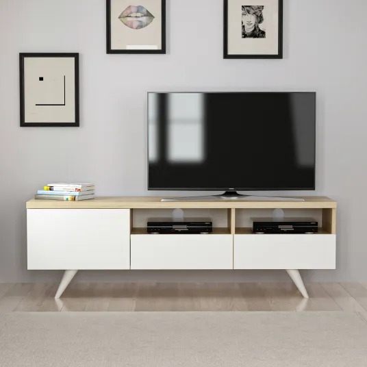 Designul elegant si minimalist al standului nostru tv este inspirat de stilul scandinav atemporal. Cu liniile sale curate, finisajul de stejar natural si accentele contrastante de alb, aceasta piesa se imbina fara efort cu orice decor interior, adaugand o nota de eleganta si rafinament spatiului dvs. de locuit.