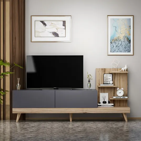 Proiectat cu gandul la conceptul scandinav, acest suport tv emana simplitate si eleganta. Combinatia de culori antracit si nuc adauga o nota de rafinament spatiului dvs. de locuit, creand un aspect elegant si minimalist care cu siguranta va impresiona.