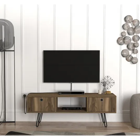 Culoarea de nuc a acestui stand tv adauga o nota de caldura si eleganta spatiului dvs. de locuit. Conceptul sau industrial aduce o vibratie unica si la moda in locuinta dvs., facandu-l piesa centrala perfecta pentru zona dvs. de divertisment.