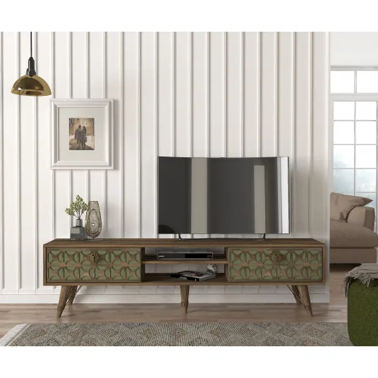 Conceptul oriental al acestui suport tv adauga o nota de rafinament si farmec oricarui spatiu. Culoarea bogata de nuc emana caldura si eleganta, ceea ce il face un accesoriu perfect atat pentru interioarele moderne, cat si pentru cele traditionale.