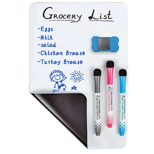 Tabla magnetica de frigider, Zggzerg, 3 markere, Stergator cu burete, A4, Usor de curatat, Spate magnetic puternic, Rezistent la apa si portabil, Potrivit pentru orice suprafata neteda, 21 x 30 cm, Alb