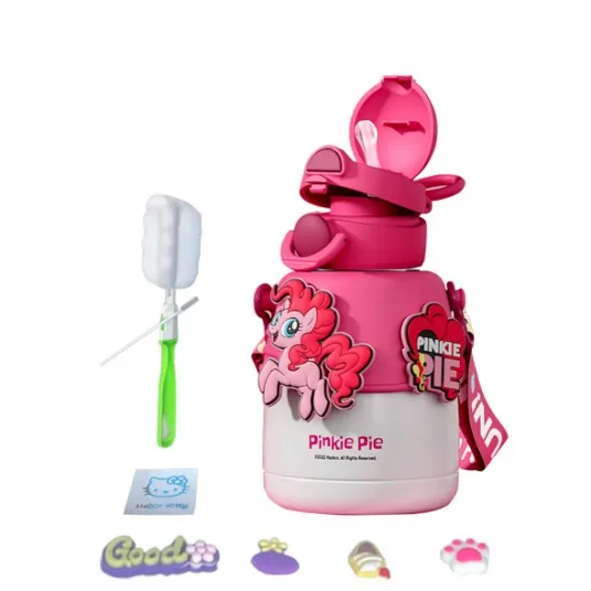 Termos copii din otel inoxidabil, 600ml, fara BPA, set cu perie si autocolante, roz