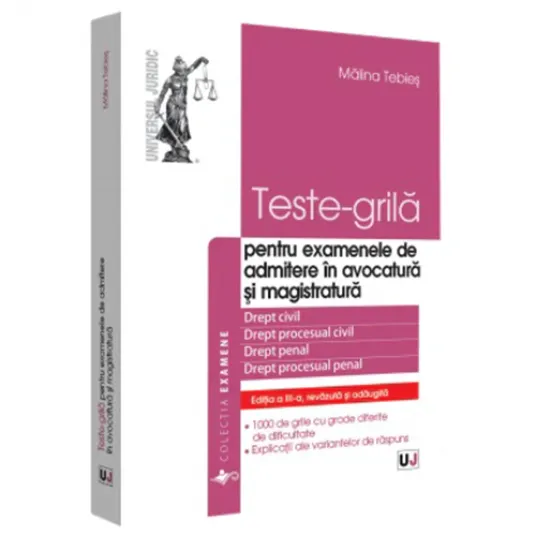 Cartea pe care ne-o propune Malina Tebies este un excelent instrument de studiu si de lucru atat pentru studentii in drept, cat si pentru practicieni. Culegerea contine peste 1000 grile concepute avand in vedere tematica si bibliografia pentru examenele de admitere in avocatura si magistratura. Autoarea prezinta, de asemenea, explicatii ale variantelor de raspuns. (Augustin Zegrean)