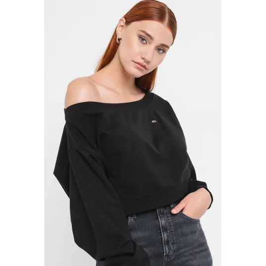 Tommy Jeans, Bluza de trening crop din amestec de bumbac organic cu decolteu pe umar, Negru, M