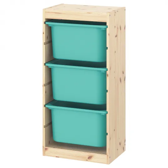 IKEA TROFAST Ansamblu depozitare+cutii, pin vopsit alb/turcoaz, 44x30x91 cm