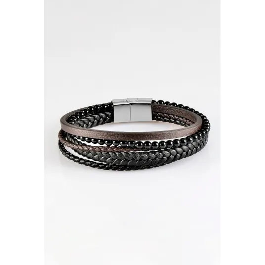 U.S. Polo Assn., Bratara cu siraguri multiple din piele si margele din onix, Negru/MaroU.S. Polo Assn., Bratara cu siraguri multiple din piele si margele din onix, Negru/Maro223681152223681152