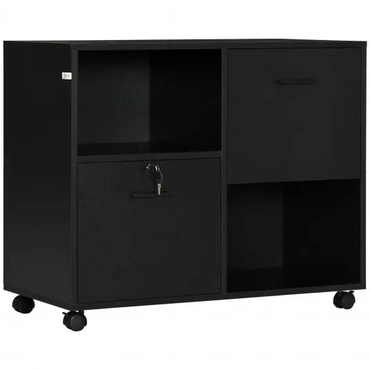 Vinsetto Dulap de Birou cu 2 Sertare pentru Dosare si Rafturi Deschise din PAL, Manere din Otel, Roti cu Blocare, 80x40x66cm, NegruAveti un birou cu putin spatiu pentru a va depozita lucrurile? Acest dulap pentru imprimanta Vinsetto este gata sa devina asistentul dvs. in timpul zilei de lucru datorita sertarelor sale spatioase si a designului care economiseste spatiu. Rotile va permit sa mutati fisetul oriunde doriti in functie de nevoile dvs., iar franele va permit sa-l blocati acolo unde aveti nevoie.222848865222848865