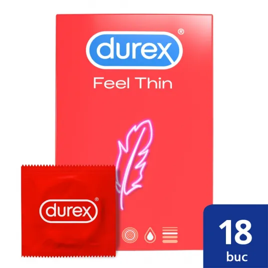 Prezervative Durex Feel thin, 18 bucPrezervative Durex Feel thin, 18 buc Prezervative Durex Feel Thin sunt prezervative subtiri pentru senzatii cat mai intense si sensibilitate crescuta in timpul actului sexual. Forma anatomica Easy-On cu rezervor pentru confortPrezervative subtiri, transparente din cauciuc natural (latex)Diametru nominal: 56 mmLubrifiere: lubrifiant siliconic standardTestate dermatologic;*100% testat electronic;***Potrivit unui studiu de toleranta cutanata realizat in 2018** Toate prezervativele Durex sunt testate pentru a depista defectele de fabricatie Senzatie naturala Durex Thin Feel este produs dintr-un latex mai subtire, pentru a spori intensitatea senzatiilor de placere pentru ambii parteneri. Conceput special pentru nevoile tale Concepute special pentru tine, proiectate pentru a-ti urma forma, pentru o experienta mai confortabila si mai placuta. Calitate Durex Durex intruneste standardele internationale de calitate***, lasandu-ti posibilitatea de a savura experiente sexuale excelente, fara bataie de cap.*** EN ISO 15223-1: 2012; EN 1041: 2008; EN ISO 10993-1: Oct 2009; EN ISO 13485: 2012; EN ISO 9001:2008; EN ISO 14971: 2012; EN ISO 4074:2015 Miros mai bine Prezervativele Durex miros mai bine datorita modului in care sunt fabricate, respectand cerintele si standardele internationale. Utilizare:Pasul 1 Rupe ambalajul pornind de la o latura zimtata si scoate cu grija prezervativul, deoarece poate fi deteriorat de unghii sau obiecte ascutite (bijuterii sau piercing-uri). A se verifica data de expirare de pe ambalajul individual inaintea utilizarii. Pasul 2 Verifica daca prezervativul este rulat spre exterior. Daca este rulat spre interior, inseamna ca este pe dos. Strange capatul inchis al prezervativului pentru a te asigura ca nu ramane aer in interior. Pasul 3 Continuand sa strangi capatul inchis, asaza prezervativul pe varful penisului si ruleaza-l in jos cu cealalta mana. Daca incepe sa se ruleze inapoi in timpul actului sexual, ruleaza-l la loc imediat. Daca iese cu totul, opreste-te si pune alt prezervativ. Imediat dupa ejaculare, cat timp penisul este inca in erectie, prezervativul trebuie tinut ferm la baza penisului, inaintea retragerii acestuia, pentru a preveni alunecarea.Prezervativele prea largi sau prea stramte se pot rupe. Pasul 4 Dupa retragerea penisului, scoate pur si simplu prezervativul, impacheteaza-l intr-un servetel si arunca-l in cosul de gunoi. Nu il arunca in toaletaCiteste cu atentie informatiile despre produs, inscriptionate pe partea interioara a pachetului, mai ales daca folosesti prezervativele pentru sex anal sau oral. Foloseste un prezervativ o singura data. Nicio metoda contraceptiva nu ofera protectie 100% impotriva sarcinii, HIV, sau a infectiilor cu transmitere sexuala.Prezervativele Durex sunt dispozitive medicale. Referitor la riscuri, citeste precautiile si instructiunile de utilizare sau intreaba-ti medicul! Consultati medicul sau farmacistul daca: utilizati unguente medicinale, aplicate pe penis sau vagin; senzatia de iritare/disconfort persista dupa utilizare; nu sunteti sigur daca sunteti alergic la latex; un prezervativ prezinta scurgeri sau se rupe in timpul utilizarii (acest lucru se face cat mai curand posibil, in termen de maxim 72 de ore); tu sau partenera ta experimentati dificultati respiratorii sau aveti buzele albastre Despre Durex:Cu peste 90 de ani de experienta, Durex reprezinta o marca de incredere pentru milioane de oameni din intreaga lume, in fiecare zi. Durex intruneste toate standardele de calitate pentru prezervative la nivel mondial, oferindu-ti incredere pentru o viata sexuala fara griji. Fiecare prezervativ este testat electronic pentru eliminarea defectiunilor si a fisurilor. Toate prezervativele Durex sunt fabricate prin tehnologia „Easy on”, datorita careia prezervativul poate fi aplicat usor si repede, fiind totodata mai confortabil.222216896222216896